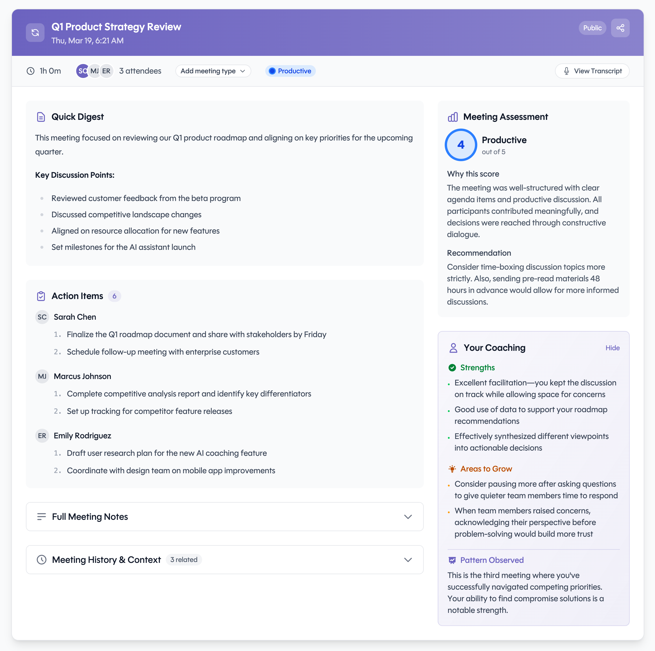 Every commitment, task, and next step extracted, assigned, and tracked. Nothing falls through the cracks.