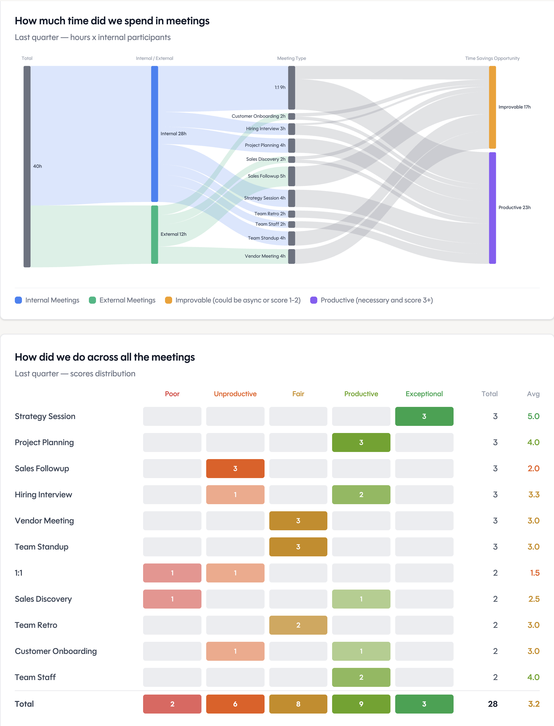 Leaders and ops teams get a real-time picture of meeting culture, alignment health, and organizational intelligence — without surveying anyone.