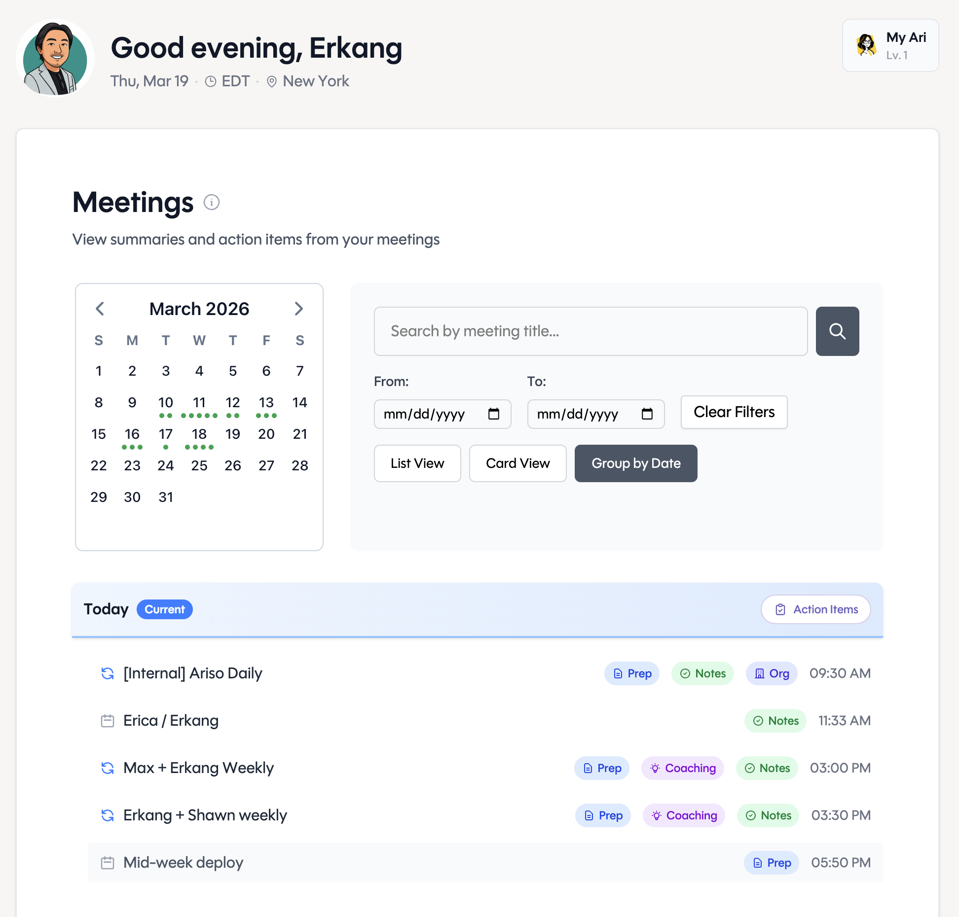 Before you join, Ari surfaces everything you need: past meeting notes, open action items, relationship context, and talking points — so you're never caught off guard.